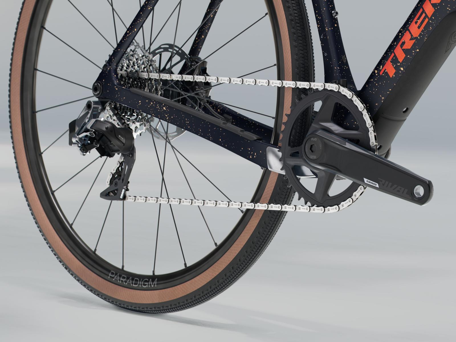 Einen Rahmen aus 500 Series OCLV Carbon samt Carbongabel, Staufach im Unterrohr, Befestigungsmöglichkeiten an Rahmen und Gabel und Platz für Reifen bis 50 mm (wie gemessen). Eine komplett drahtlose SRAM Rival AXS 1x12-Schaltung, hydraulische Scheibenbremsen, eine Carbonsattelstütze und Bontrager Paradigm Comp Tubeless-Ready-Laufräder mit 42 mm breiten Reifen.