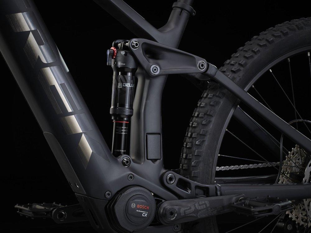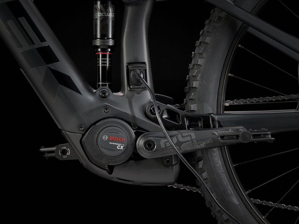 Einen Rahmen aus OCLV Mountain Carbon mit 150 mm hinterem Federweg, einen komplett integrierten, 625 Wh starken Akku, eine für E-Mountainbikes optimierte RockShox 35 Gold RL-Gabel mit 160 mm Federweg, einen kraftvollen Performance Line CX-Motor von Bosch mit 250 W Leistung und 85 Nm Drehmoment zur Tretunterstützung bis 25 km/h und einen Purion-Controller. Dazu gibts einen Shimano Deore 1x12-Antrieb mit breitem Übersetzungsbereich für eine stets optimale Trittfrequenz, eine Variosattelstütze, kraftvoll zupackende hydraulische 4-Kolben-Scheibenbremsen für mehr Vertrauen auf Abfahrten und 29 zöllige Laufräder von Bontrager mit wend